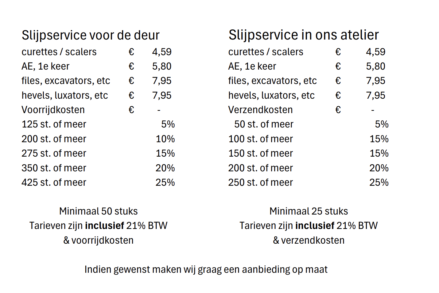 Tijdens onze afspraak plannen we meteen een nieuwe afspraak. Mocht u al eerder het gevoel hebben dat uw gereedschappen weer geslepen mogen worden, dan volstaat een telefoontje of mailtje en passen we direct de eerder gemaakte afspraak aan. Het gaat ons om één ding: dat u met scherpe instrumenten kunt werken.